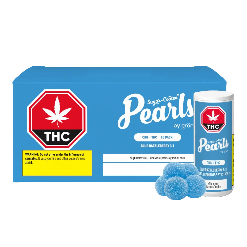 Canada's favourite gummy is now in a grab 'n go party bag. 10 individual tubes each with 5 Blue Razzleberry Pearls in a 3:1 CBG/THC ratio. Each sugar-coated soft chew has 6 mg of CBG and 2 mg of THC.