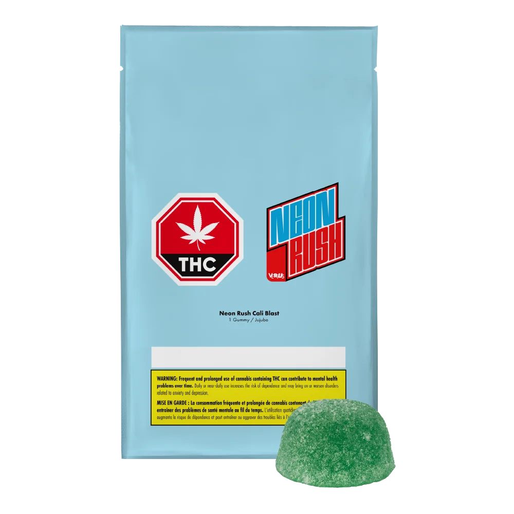 Versus Neon Rush Cali Blast Gummy a mountainous splash of tropical-lime flavour alongside 10 mg THC and 10 mg of naturally occurring caffeine.