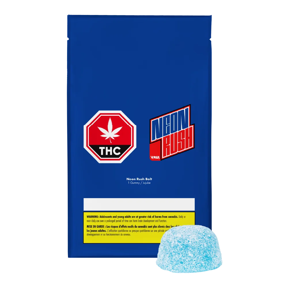 Get ready for a mountainous rush of flavour with new Versus Neon Rush Bolt 10 mg Gummy! This bite-sized gummy delivers max THC (10 mg), naturally occurring caffeine (10 mg), and a refreshing surge of sweet, fizzy flavour! Crafted with a pectin base, Versus Neon Rush Bolt Gummy is packed with a bold, raspberry citrus flavour that follows suit of Versus Neon Rush Bolt Beverage.