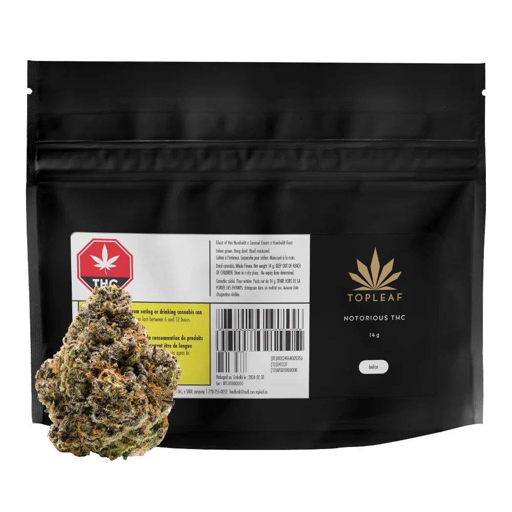 Top Leaf Notorious THC is a high-powered indica crafted from the legendary Ghost of Von Humboldt, Caramel Cream and Humboldt Frost. Its nutty, earthy aroma with skunky and sweet notes, delivers an unparalleled smoking experience. Celebrated for its potent, creeping and heavy-hitting effects, this strain is perfect for those who demand the finest quality and a memorable experience.