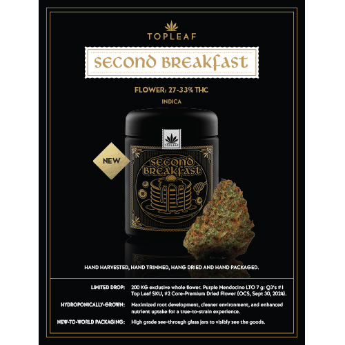 Top Leaf Second Breakfast is a limited-edition, hydroponically grown indica. Enjoy bold, sweet, and gassy flavors with invigorating effects—perfect for elevating your mornings and beyond.
