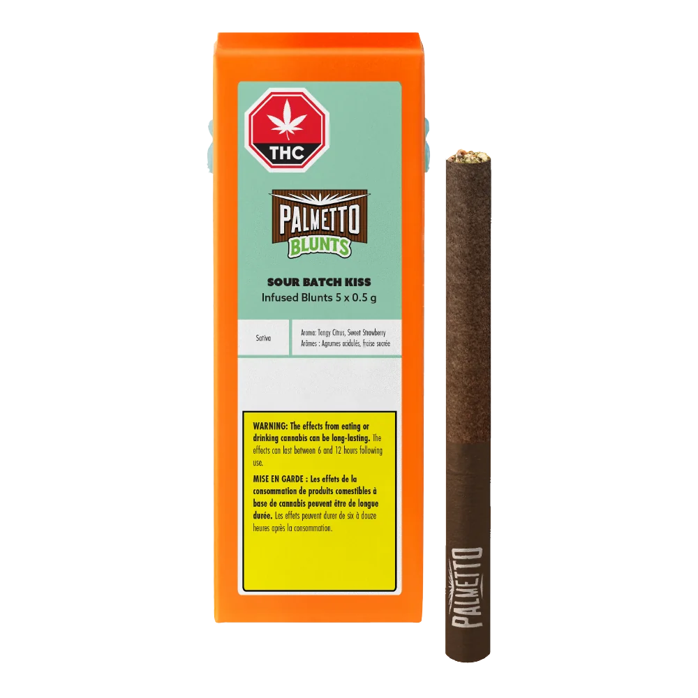 Sour Batch Kiss Infused Blunts deliver a smooth burn with premium hemp blunt paper in a slim straight-cut pre-roll, blending sweet strawberry notes with a tart citrus kick. Palmetto's newest infused sativa perfectly balances the sweetness and tangy notes of the strain. Meticulously blended with distillate for a flavorful and potent experience.