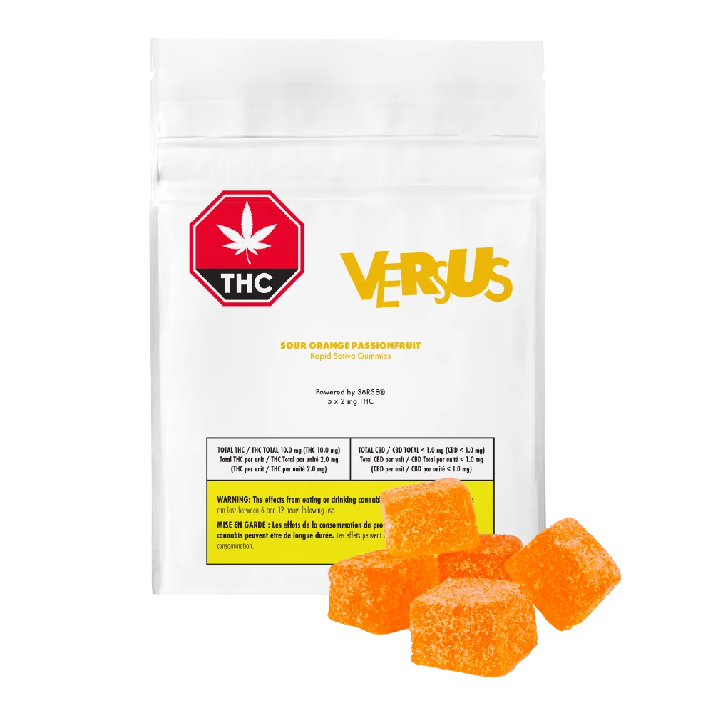 Enjoy a tropical twist with Versus Sour Orange Passionfruit Rapid Sativa Gummies! These gummies combine the bright sweetness of orange with the exotic flavour of passionfruit, finished with a delightful sour kick. Dose your way with 5 gummies at 2 mg THC each (10 mg THC per pack). Made with SōRSE® cannabis emulsion technology which delivers a rapid and consistent onset with almost no cannabis taste or smell.