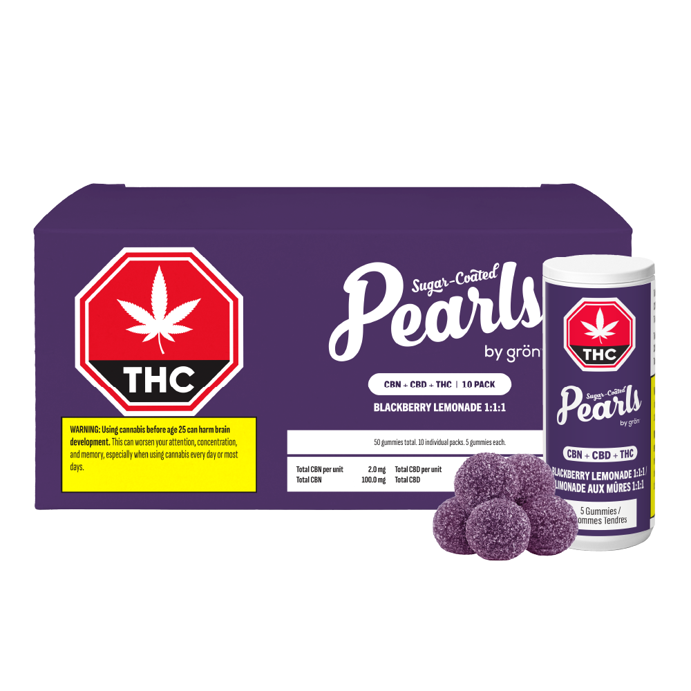 Pearls by Grön Blackberry Lemonade is now in a grab ’n go 10-pack box, with 10 individual tubes each holding 5 sugar-coated soft chews. Every gummy carries a 1:1:1 ratio with 2 mg THC, 2 mg CBD, and 2 mg CBN. That’s 100 mg of each cannabinoid in total. Bursting with the tart sweetness of blackberries and the citrus pop of lemonade, these Pearls bring fruit-forward flavour in a format made for sharing or stocking up.
